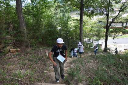 配られた地図をもとに、班で意見を出し合い、多くのビンゴを目指して野外センターの敷地内を探検しました。