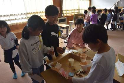 1年生が、生活科「どんぐりまつりをひらこう」の学習で、2年生をどんぐりまつりに招待し、作ったものを使って一緒に秋の遊びを行いました。