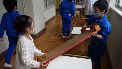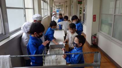 2年生の子たちが、1年生に当番の仕事を伝えながら、初給食当番を行いました。2年年生は、丁寧に一緒に動きながら優しく教えることができました。1年生の子たちも、真剣に聞いて、当番の仕方を覚えていました。