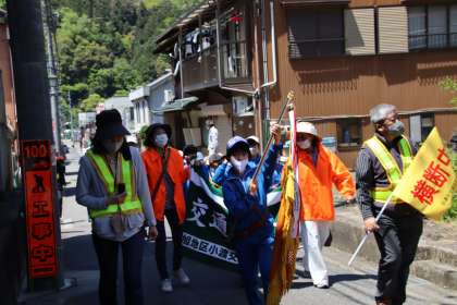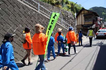 開会式では、足助警察署長様のお話をいただき、出発しました。途中では、地域の方の声援をいただき、子どもたちは、交通安全の標語を唱和しながら歩きました。