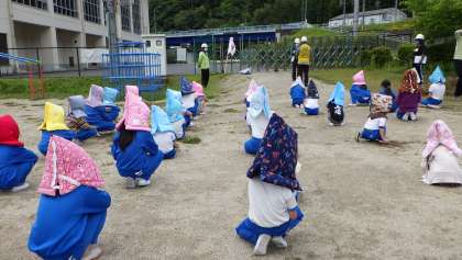 マグニチュード5強の地震が起きたという想定で行いました。はじめに、揺れと同時に机の下にもぐりました。揺れが収まったら、静かに並んで第一避難場所まで避難しました。避難の後、校長先生の「地震はいつ起きても不思議ではない」というお話を真剣に聞いていました。