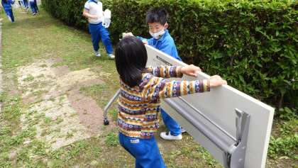 3・4年生の役割は、水の確保と長机の設置でした。水の確保では、避難食を作るための水道が止まり、避難所に設けられた水のタンクから、水を運ぶのにバケツもないという設定です。3・4年生の子どもたちは、きれいな買い物袋に水を入れて、「大変だ」と言いながらも何度も往復しながら運んでいました。