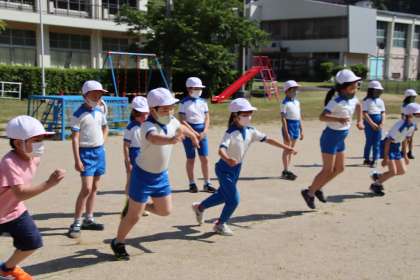 この日のテーマは、走るです。はじめに、スキップ、次に後ろ向きスキップをしました。最後に、ペアでじゃんけん追いかけっこをしました。ソーシャルディスタンスを取りながら、走るときはマスクを外すなど、いろいろルールはありましたが、子どもたちは、楽しく体を動かすことができました。