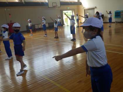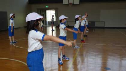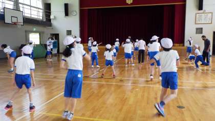 6月15日(火)の朝の活動の時間に、全校が体育館に集まって、体力づくりをしました。