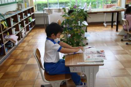 はじめに、よく咲いているアサガオの花をちぎって、紙にはさみました。次に、のりなどの棒状のもので上から転がしたり、叩いたりしました。最後に、紙を広げると、アサガオの模様ができていて、子どもたちは、それを見て、「わあ、できた」と歓声を上げていました。