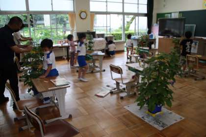 7月7日(水)の5時間目に、1年生が生活科で「なつとなかよし」という学習で、育てているアサガオの花を使って、たたき染めをしました。