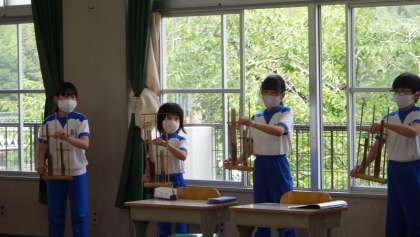 第2回目の練習となり、各楽器に分かれて練習しました。アンクルンでは、ロングトーンで4拍、2拍、1拍ずつ音階で鳴らす練習をしました。竹楽器は、音が切れないように少し長めに、次の音と重ねて音を出します。前の音をよく聞いて、つなげるように演奏しました。まずは、長い拍数から順に練習して、だんだん拍数を短くして練習しました。そして、全校合奏曲「もみじ」の頭の部分だけ演奏しました。初めてでしたが、高学年がリードしながら、演奏することができました。