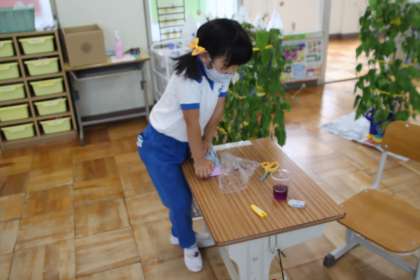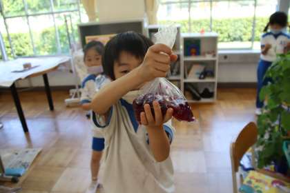 学校で育てている一人一人のアサガオの植木鉢を教室に持ってきて、少しずつ花を摘みながら、袋に入れてつぶしました。少しつぶしただけで色がたくさん出てきました。その色水に折りたたんだ紙をつけて、色水染めをしました。きれいな色に染めることができました。