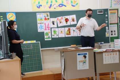 外国語活動(1・2年) 公開日 2021/07/19 更新日 2021/07/19 各学年から 7月14日(水)に1・2年生が外国語活動を行いました。 この日のテーマは、昆虫を名前を覚えることです。子どもたちは、ALTの先生に続いて、絵を見ながらリズムよく昆虫の名前を何度も発音しました。覚えたばかりの昆虫の単語を使って歌を歌ったり、昆虫の紙芝居を聞いたりして、楽しく昆虫の名前を覚えることができました。