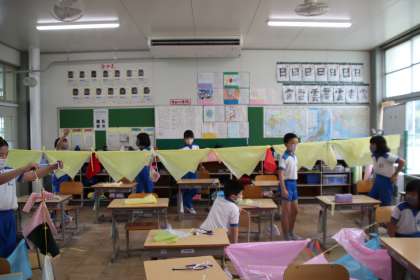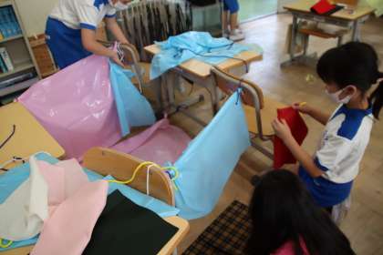 学習課題は、「結び方を知り、布を結んでつなげてみよう」です。まず始める前に、動画で「かたむすび」「りぼんむすび」を確認したのですが、正しい結び方は難しく、時間がかかってしまいました。次に習った結び方で、教室の中の空間を使って、自由に結んで何かできないか、創作活動をしました。すると、テントや家、万国旗など、楽しいアイデアの作品ができました。子どもたちは、互いのアイデアを見て、どうすると空間を楽しく飾ることができるのかを学び合うことができました。