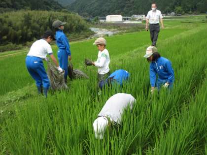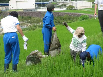 田んぼの草取り(5・6年) 公開日 2021/07/30 更新日 2021/07/30 各学年から 7月16日(金)に、5・6年生が田んぼの草取りをしました。 田んぼの泥の中に入って、稲を倒さないように気をつけながら、草を抜きました。子どもたちは、泥に足を取られながらも、一生懸命に草を取りました。短い時間なので、草を取りきるのは難しかったですが、子どもたちにとっては、稲を育てる大変さを知る機会となりました。