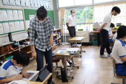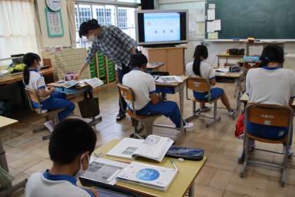 国語の「新聞の見出しを考えよう」という学習で、担任の先生からタブレットで配付された課題に自分の考えた文字を入力して、タブレットを通して先生に提出しました。この日は、ICT支援員の方にも入っていただき、一人一人の学習のサポートしていただきながら、進めていきました。子どもたちは、資料の新聞記事を読んで見出しを真剣に考えながら、学習に取り組んでいました。