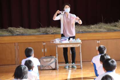 10月4日(月)の朝の活動の時間に、全校が体育館に集まって、全校活動を行いました。この日のテーマは、「アイスクリームをつくろう」でした。