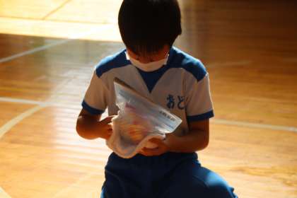 はじめに、アイスクリームの材料を先生が袋に入れました。次に、子どもたちがおどっ子ファミリー班ごとに冷えた氷の袋の中央に、材料の入った袋を入れて、順番にシェイクして、アイスクリーム作りに挑戦しました。子どもたちは、出来たアイスクリームを触りながら、氷に塩をまぶすと温度が冷えて、アイスクリームを作ることができるということを体感しました。身近なもので理科の実験ができることを学びました。