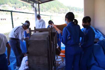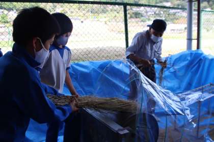 10月5日(月)に、地域講師の方に来ていただき、9月に稲刈りした穂の脱穀と唐箕による選別をしました。
