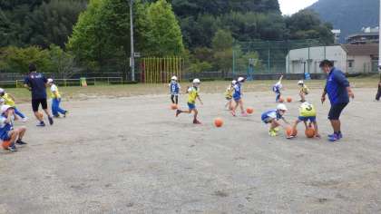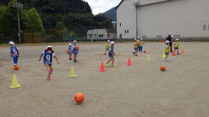はじめは、ボールをバトンの代わりにボールでタッチしてしてダッシュ、次にコーンんを使ったジグザグダッシュ、三つ目はドリブル、四つ目は、ボールの蹴り方とシュートをしました。ボールの蹴り方では、足の親指、小指でボールを転がし、足の裏で止めるなどを教えていただき、ボールに慣れることができました。休憩をはさんで、最後に2チームに分かれて、サッカーの試合をしました。コーチにルールを教えてもらいながら行いました。子どもたちは、生き生きとした顔で、体をいっぱい動かして、サッカーを楽しんでいました。
