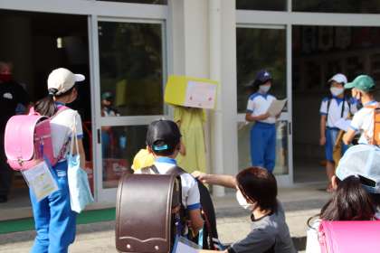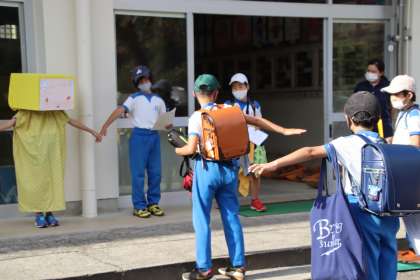 「みつなしくん」とは、ヘルシー委員会で考えたコロナによる三密を避けるためのマスコットキャラクターです。ヘルシー委員と「みつなしくん」の呼びかけで、「集まって並ぶときは、両手を広げて前後当たらないように間をあけて並ぶこと」を実践しました。これからも、健康に過ごせるように、みんなで気をつけていくことを全校で確認しました。