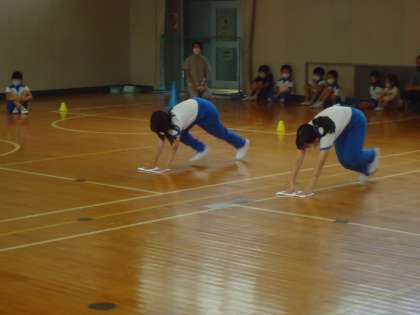 体育館の北から南に向かって雑巾がけをして、その速さを競う大会です。はじめに、3年生からスタートして、4年生、1年生、2年生、5年生、6年生と学年ごと競いました。教室よりも長い距離なので少し大変でしたが、しっかりと腰を上げ真剣に取り組んでいました。