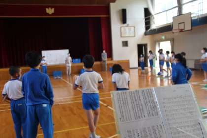 6年生のリーダーの子の合図で、最初は、ロングトーン4拍、次に2拍、1拍と音階練習をしました。その後、パートに分かれて曲の練習をしました。