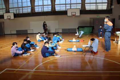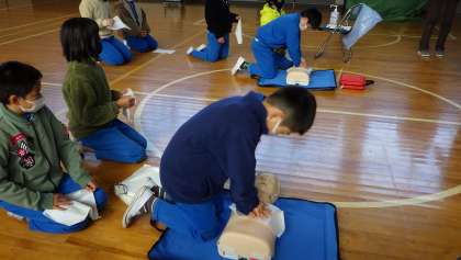 子どもたちは、命を助けるためには迅速な行動が必要だということを知り、どんな行動をとるとよいかを講師の方に指導していただきながら、真剣に取り組んでいました。