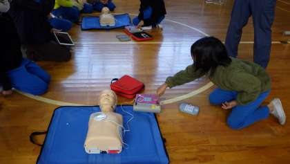 その後、心臓の位置を確かめながら、人形を使って、心臓マッサージやAEDの使い方を体験しながら学びました。