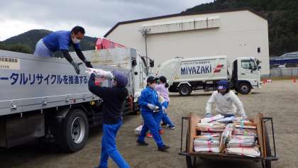 3年生から6年生の子どもたちは、PTAの方々や地域の方々が運んできてくださる資源(新聞紙や段ボール、空き缶など)を各袋に入れたりトラックに積み込んだりして、みんなで協力しながら、積極的に作業していました。