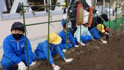 1・2年生は、この時間来年度の1年生を迎えるための花壇づくりをしました。花壇には、4月に色とりどりのチューリップの花が咲くように、たくさんの球根を植えました。