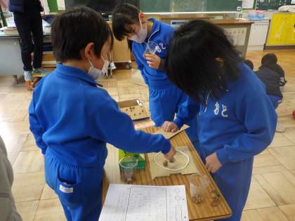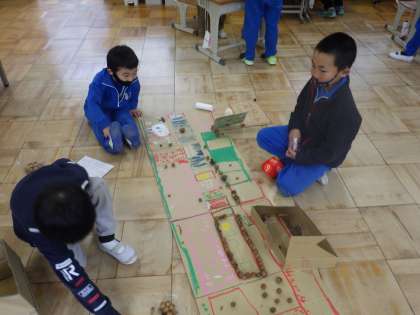1年生は、生活科で秋に拾ったドングリを使って、おもちゃ作りをしてきました。2年生を招待するため、作ったおもちゃで遊んで、アドバイスし合って、より良いものに直してきました。この日は、ドングリをお金に見立てて「1ゲーム3ドングリ」など、ルールを自分たちで決めて、2年生に楽しんでもらうために、1年生みんなで協力して取り組んでいました。