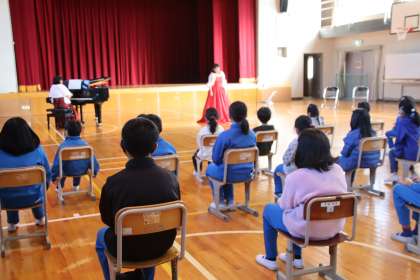 12月23日(木)の5時間目に、体育館にDuo le lienの二人の方に音楽講師としてお越しいただき、「ソプラノと楽しい連弾のコンサート」をしていただきました。