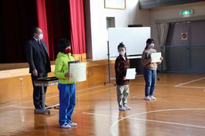 初めに表彰をしました。全校で取り組んだ「小原杉田久女俳句大会」で優秀作品として選ばれた子、マラソン大会で入賞した子、「お弁当作りコンテスト」で優秀者として選ばれた子が表彰されました。