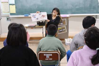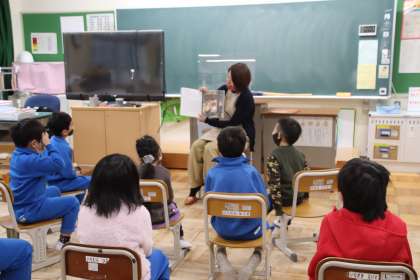 5・6年生では、生き物の特徴についての絵本でした。子どもたちも知っているものには答えながら、生き物の不思議を面白く学んでいました。