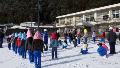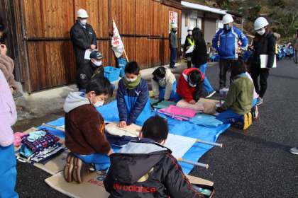 次に、「ダム決壊のため、第2次避難をしなくてはいけない」という連絡が入った想定で、学校から第2避難場所である産直広場に避難しました。5・6年生は、怪我人が出たという想定で、応急手当も行いました。12月にも消防署の方を講師に、救急救命について学んだので、落ち着いて高学年で協力して行うことができました。