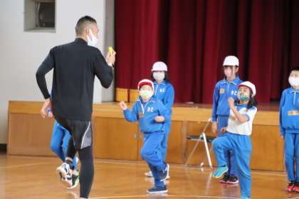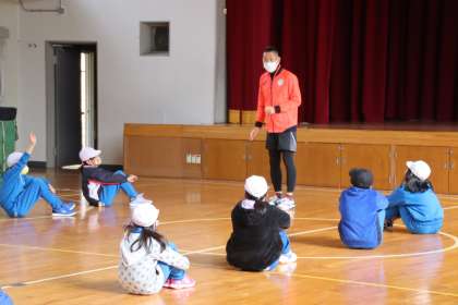 1月25日(火)の3時間目に、オリンピック選手で中京大学の青戸慎司さんにお越しいただき、3・4年生が「走り方教室」を行いました。