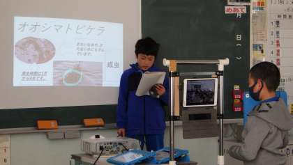 最初に小渡小学校の3・4年生が、総合的な学習で調べてきた地域の生物について発表しました。学校の周りや地域の川の水生生物調査で見つけた生き物を、一人一つに絞って詳しく調べました。それについて、タブレットを使ってわかりやすく画面にまとめ、見せながら発表しました。