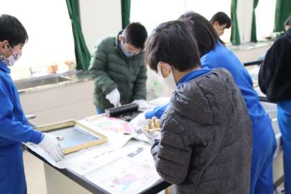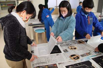 2月2日(水)の1・2時間目に、3・4年生が木版画の印刷をしました。