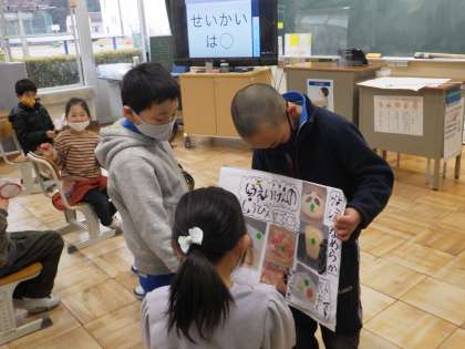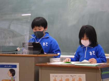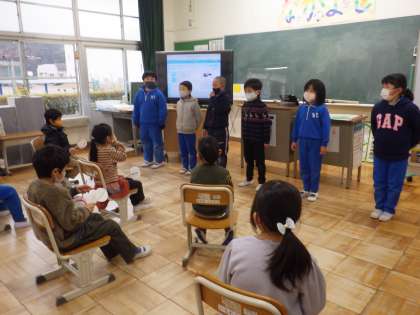 これまで、小渡の町を探検して、商店などを回り、出会った地域の人にいろいろなことを教えていただいたり、気づいたりしたことをまとめてきました。それを画像で見せながら1年生に発表しました。その後は、クイズを出したり、質問をしたりして1年生が楽しく参加できるように工夫しました。1年生は、来年度の「町探検」の授業が楽しみになりました。