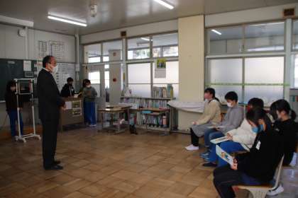 最後に、全校の子どもたちからのメッセージカードを5年生が代表で渡しました。また、6年から5年生に校旗、通学班旗、縦割り掃除ファイルを渡す引継ぎも行いました。