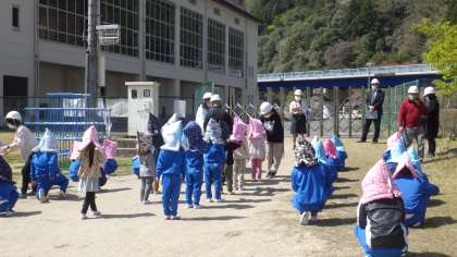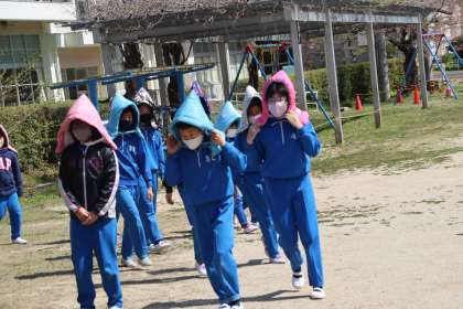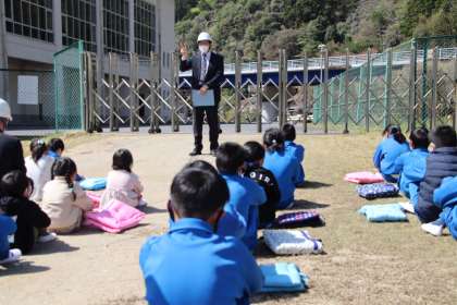 火災のブザーが鳴ると、子どもたちが事前に学級活動で学んだように、放送をしっかり聞いて、静かに外に避難しました。その後、校長先生から、命を守るために何をしなくてはいけないかのお話を聞きました。いざというときに、落ち着いて行動ができるように、今回学んだことを生かしてほしいです。
