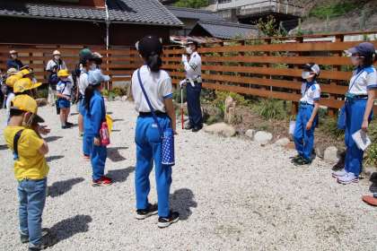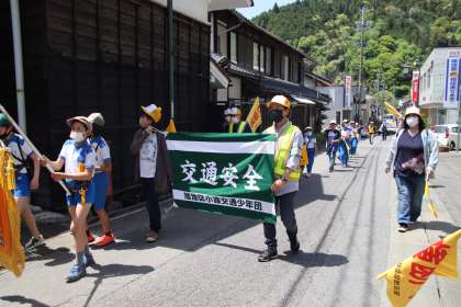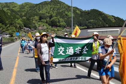 全校児童と小渡こども園園児、PTA役員、保護者、教職員、園職員が参加しました。また、足助警察署の方の3名の方にお越しいただき、安全指導もしていただきました。開会式が終わると、交通安全の標語を唱和しながら、小渡の商店街を歩きました。町の方たちも応援に来ていただきました。この行事を通して、全校児童・園児が、これからも、交通安全に気をつけながら過ごしていくことを確認しました。
