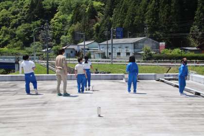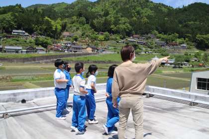屋上から地域を見ると、「山に囲まれているね」「支所が見えるよ」「下切の家も見えるよ」など、たくさんのことを発見することができました。見学の後は、自分の学校の近くの様子で見つけたことを教室で話し合いました。