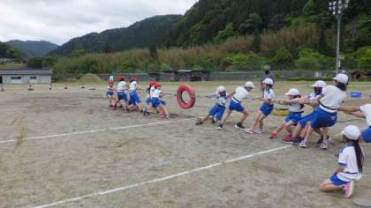 しっぽ取りの練習では、作戦タイム取って、赤白で作戦を成功させるように練習しました。綱取りでは、一つの綱を引き終わると、まだ頑張って綱を引いている仲間のところに走って応援に行くなど、それぞれのチームで協力して競技をしていました。
