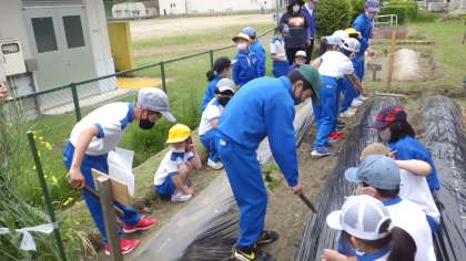 おどっ子ファミリー班に分かれて、サツマイモの苗を植えました。苗を植えるところに穴をあけ、苗を入れて土をかぶせました。班ごとに教え合いながら、苗を植えることができました。