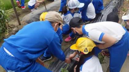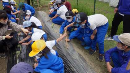 5月16日(月)のお昼の休み時間に、全校でサツマイモの苗植えをしました。
