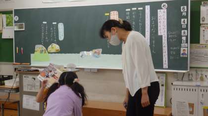 1年生は、算数の「いろいろなかたち」を学習しました。ボールや円柱、四角い箱などたくさんの箱などから、似ている形を見つけて、どんなところが似ているか考える内容でした。子どもたちは、箱をいろんな向きにしながら、一生懸命に考えていました。
