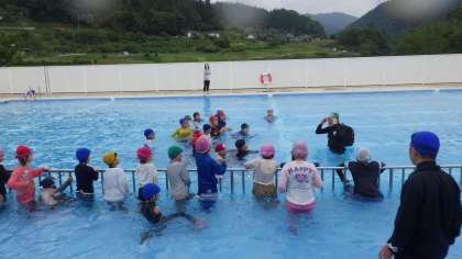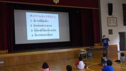 もし、川や海に間違って落ちてしまった場合、どのように命を守るかの学習でした。講師の方に教えていただいたキーワードは「ういて、まて」でした。身の回りの物でも、水に浮くものがあります。これを浮き代わりにして、ラッコのように浮いて、救助を待つという方法を学びました。かばんやペットボトルなど、水に浮くものを教えていただき、子どもたちは、ペットボトルを浮き代わりにして、浮く練習をしました。この日は、3年ぶりのプールの日でしたが、楽しく学習することができました。