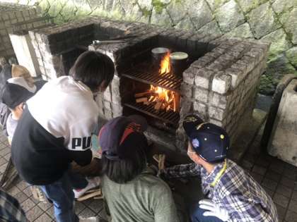 野外炊飯場で、火おこし体験をした後、カレーライス作りを行っています。火おこし体験は、火おこし器とマグネシウムの棒で火花をおこすファイアスターターという二つの道具で体験をしました。体験後は、ファイアスターターで火係の子どもたちが火をつけて、炊飯が始まりました。間もなく飯ごうのご飯が炊き上がります。美味しいカレーを楽しみにしています。