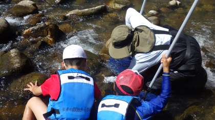 最初に、学校の近くを流れる矢作川に住む水生生物を採取しました。講師の方に教えていただき、石の下や草の陰に隠れている水生生物をたくさん見つけることができました。