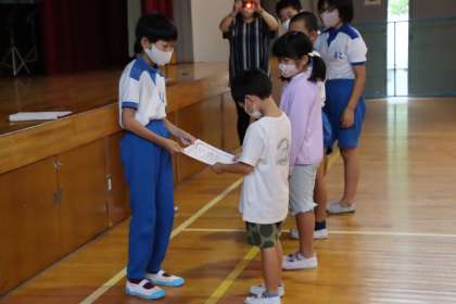 また、この日は第2回のおどっ子ギネス大会(紙飛行機大会)で、学年で一番だった子の表彰もしました。表彰された子は、5・6年生の手作りの表彰状をもらって、とてもうれしそうでした。