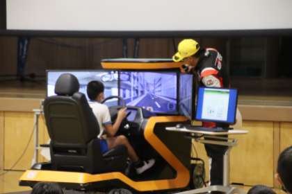 最初に、豊田市長様からご挨拶いただいた後、ラリー選手の勝田範彦さんや槻島ももさんに、ラリーではどんな車で走るのかやどんな道を走るのか、またコドライバーの役割など、わかりやすく教えていただきました。その後、各学校の代表の子が、シミレータードライブ体験をしました。映像に合わせてハンドルを切るのは、とても難しそうでした。