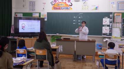 はじめに、旭給食センターの栄養士の先生に、食事のマナーや正しいはしの使い方などについて、教えていただきました。